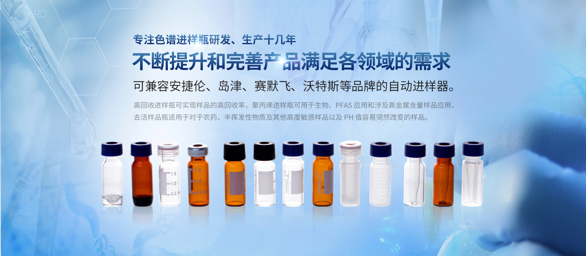 浙江哈邁科技有限公司(簡稱HAMAG),成立于2005年,總部位于美麗的海濱城市寧波,是中國優(yōu)質(zhì)色譜進(jìn)樣瓶、樣品瓶供應(yīng)商,是一家專業(yè)從事色譜耗材的科研、設(shè)計、生產(chǎn)、銷售和系統(tǒng)集成為一體的生產(chǎn)型企業(yè)。經(jīng)過十幾年的研發(fā)與努力,通過和國內(nèi)外多個科研部門,浙江大學(xué)理工學(xué)院,同時與品牌:安捷倫、沃特世、島津等公司的技術(shù)交流與學(xué)習(xí),我們成功的研制開發(fā)出實(shí)驗室分析設(shè)備專用的各種型號的自動進(jìn)樣瓶、頂空瓶及其配套蓋墊;特氟龍與硅膠復(fù)合墊片;特氟龍/硅膠制品;創(chuàng)新型固相萃取儀;針式過濾器等幾十種實(shí)驗室耗材及關(guān)聯(lián)產(chǎn)品...